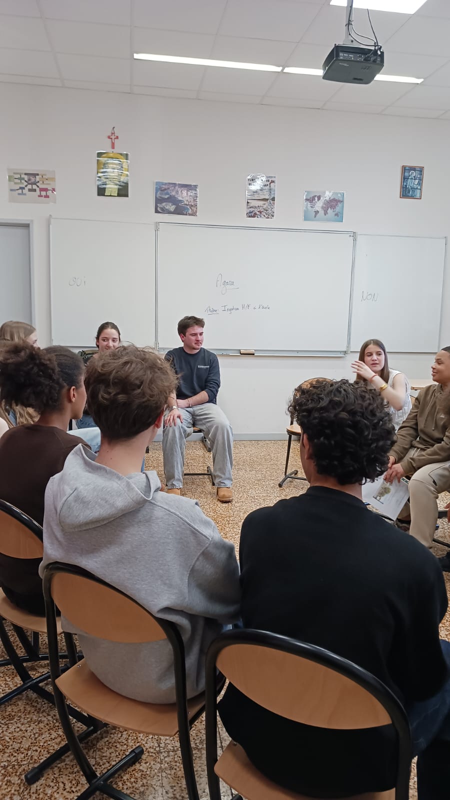 Les élèves de 3ème ont récemment bénéficié de l’intervention du groupe AGORA, composé de lycéens volontaires de Notre-Dame de la Merci venus animer des groupes de parole autour de différents sujets de société.