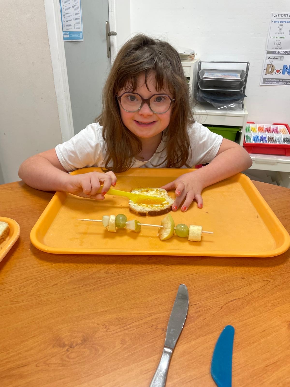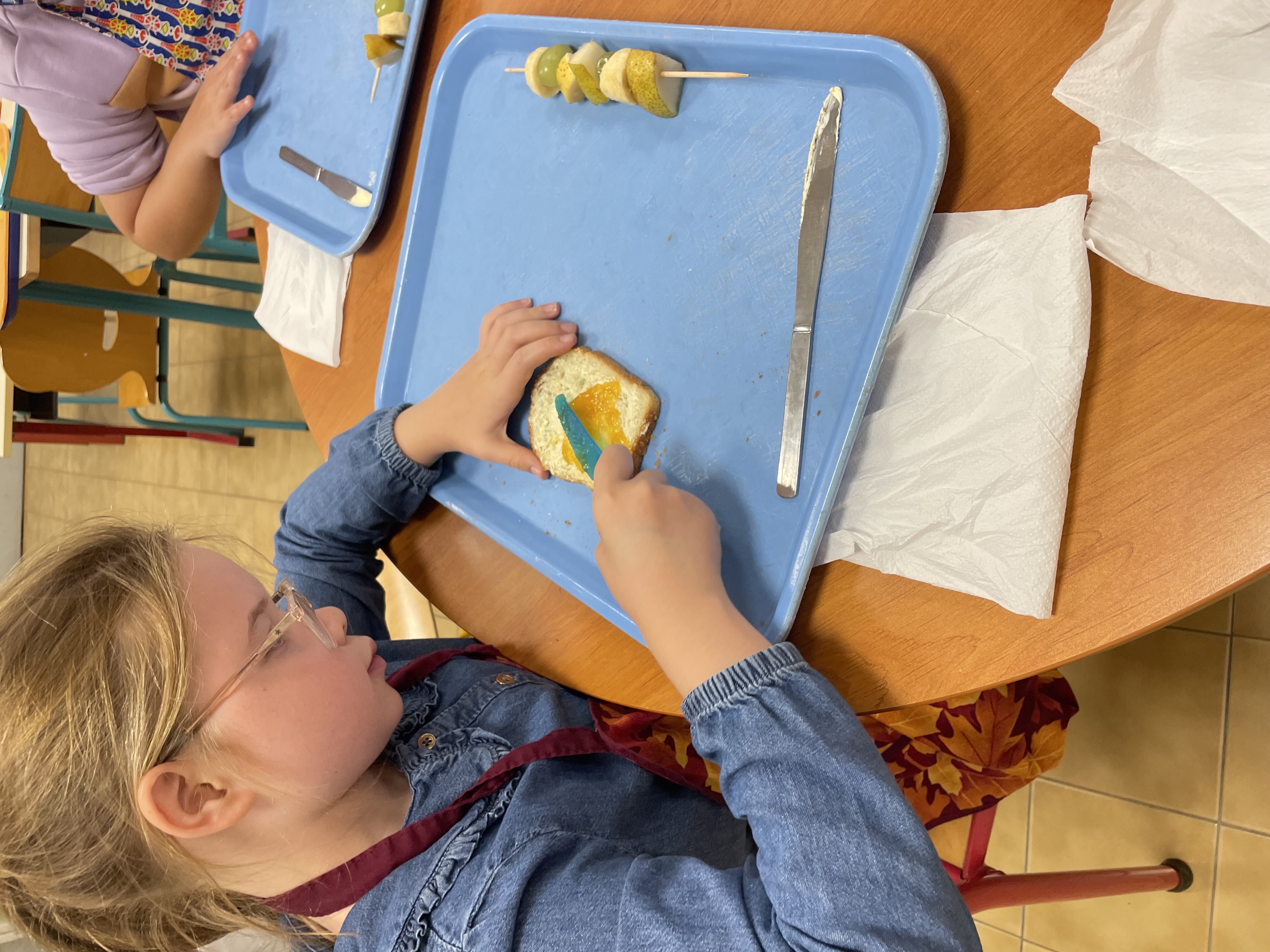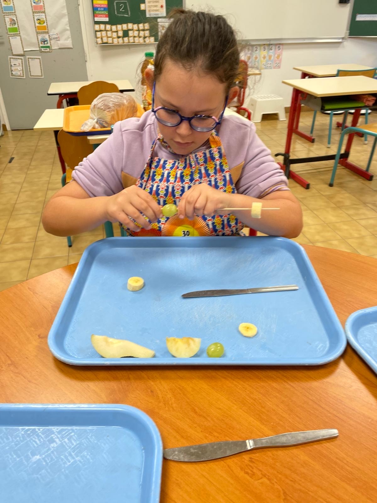 après-midi, nous avons préparé des brochettes de fruits, des tartines